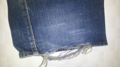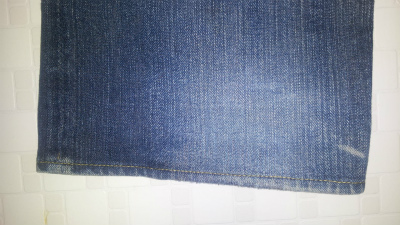 裾は一度解体してから穴を塞ぎ、弱い部分を補強してから、チェーンステッチで裾上げしてあります。